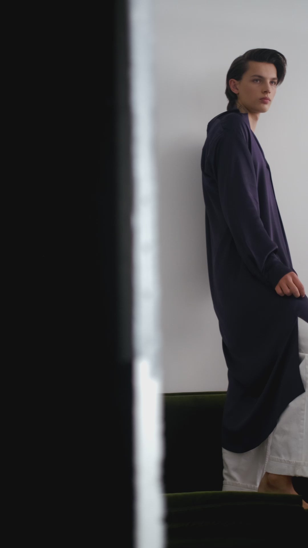 The long silk nightshirt evokes the understated elegance of stars like Cary Grant or Humphrey Bogart in private, off-screen moments. Worn as a caftan over a pants for the day (its ‘boardroom’ side), and as pajamas in the bedroom, it’s an ultimate chameleon piece. It could perfectly fit for ladies as well.